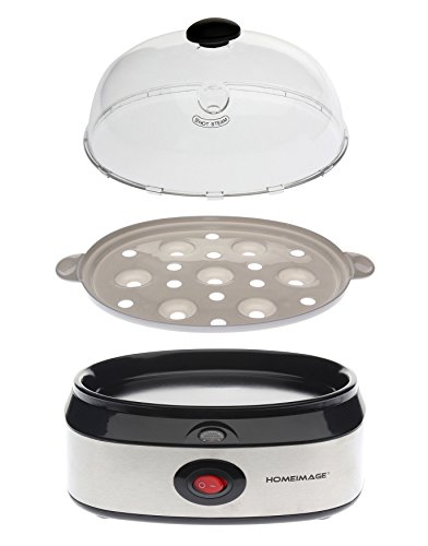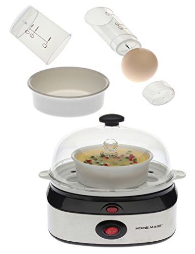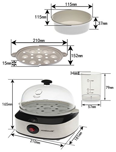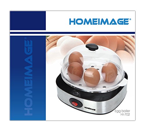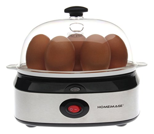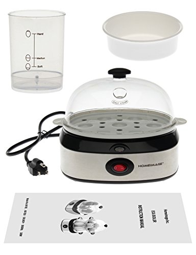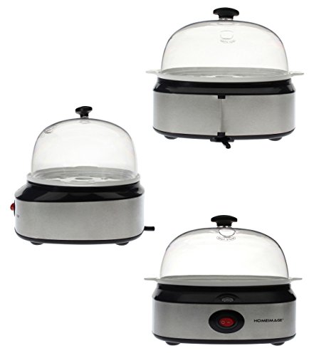 This modern stainless steel design egg cooker boils up to seven eggs at one time or poaches one or two eggs in a tray. You can use the calibrated water-level indicator to pour the precise amount of water needed to soft-, medium-, or hard-boil one to seven eggs. The indicator has a steel pin in the bottom for piercing eggshells; this will leech out the sulfur so yolks remain yellow during cooking rather than turning green. Assuming the proper amount of water is in the egg holder, you can monitor to ensure the eggs are cooked to the desired level, and then indicator light will turn off when the hard-boiling is completed. 6 minutes for soft boiled, 9 minutes for medium, and 12 minutes for hard-boiled. The plastic egg holder is removable, letting you cool the eggs under running water. Everything cleans easily, including the nonstick coating on top of the boiling plate.Feature