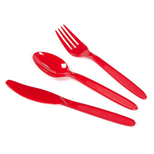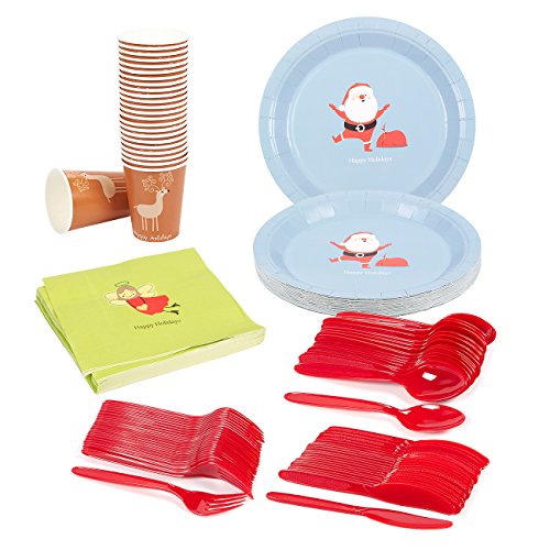 -. Feature : SERVES 24: This Christmas themed set includes enough tableware for 24 guests; contains 24 of each of the following: Plastic Knives, Spoons, Forks and Paper Plates, Napkins and Cups. The plastic silverware is in a festive red color while the paper plates, napkins and cups are in blue, green and orange, respectively. A joyful-looking santa is illustrated on the plates while the napkins feature a flying angel, and the cups, a reindeer. / HIGH QUALITY: Plates are thick and rigid and won't fold while carrying food. Napkins are soft and absorbent--a pleasure to use. / SAFE & ENVIRONMENTALLY FRIENDLY: Flatware set is 100% Food Grade and BPA-Free. Plates, Cups and Napkins are made of environmentally friendly biodegradable paper. / GREAT FOR ALL OCCASIONS: Suitable for all occasions including parties, catering, outdoor events and simply just eating at home. / DIMENSIONS: Flatware is approximately 6 inches long. Paper cups hold approximately 9 oz of liquid. Napkins are 3-layer and measure 13 x 13 inches when unfolded and 6.5 x 6.5 inches folded. Plates are approximately 9 inches in diameter.