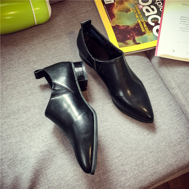 欧美女春秋季尖头中跟单鞋加绒棉鞋英伦乐福休闲百搭黑色小皮鞋潮