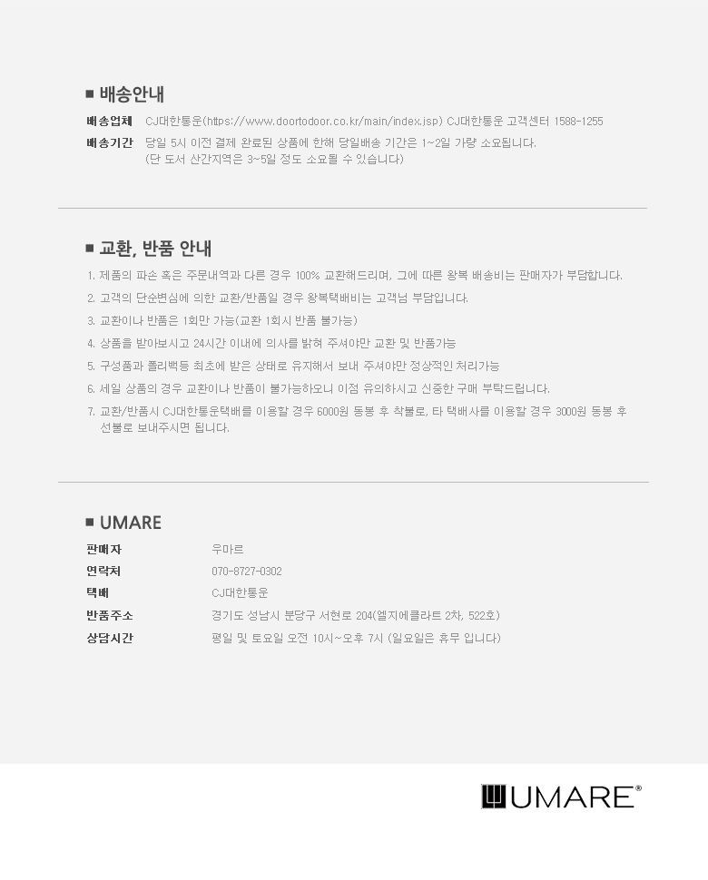 특이 사항 배송, 변경, 반품 환불에 대한 문의는 위 연락처로 문의 주세요.