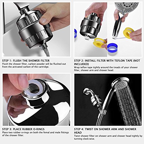- FILTER CHANGE - The cartridge needs to be changed every 5-6 months for a 4 member family. One cartridge is enough to effectively clean 10,000-12,000 gallons of water (for precise calculation, you need to know the quality of water at your home). Keep in mind that changing the cartridge on time is a must to keep the shower filter working effectively