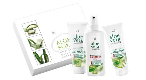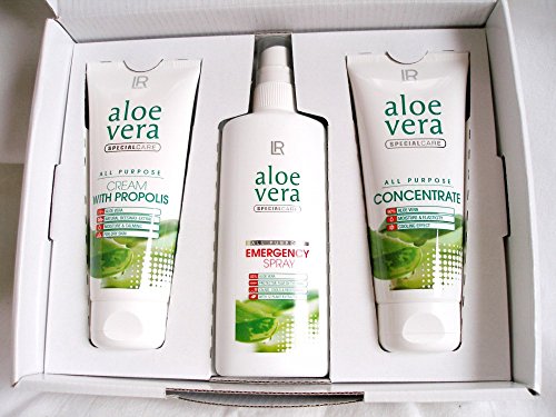The set contains: Aloe Vera All Purpose Cream with Propolis - %79 Aloe Vera ( 100 ml) Aloe Vera Concentrate - %90 Aloe Vera ( 100 ml) Aloe vera Emergency Spray - %83 Aloe Vera ( 150 ml) - Special size only available in the Box set)