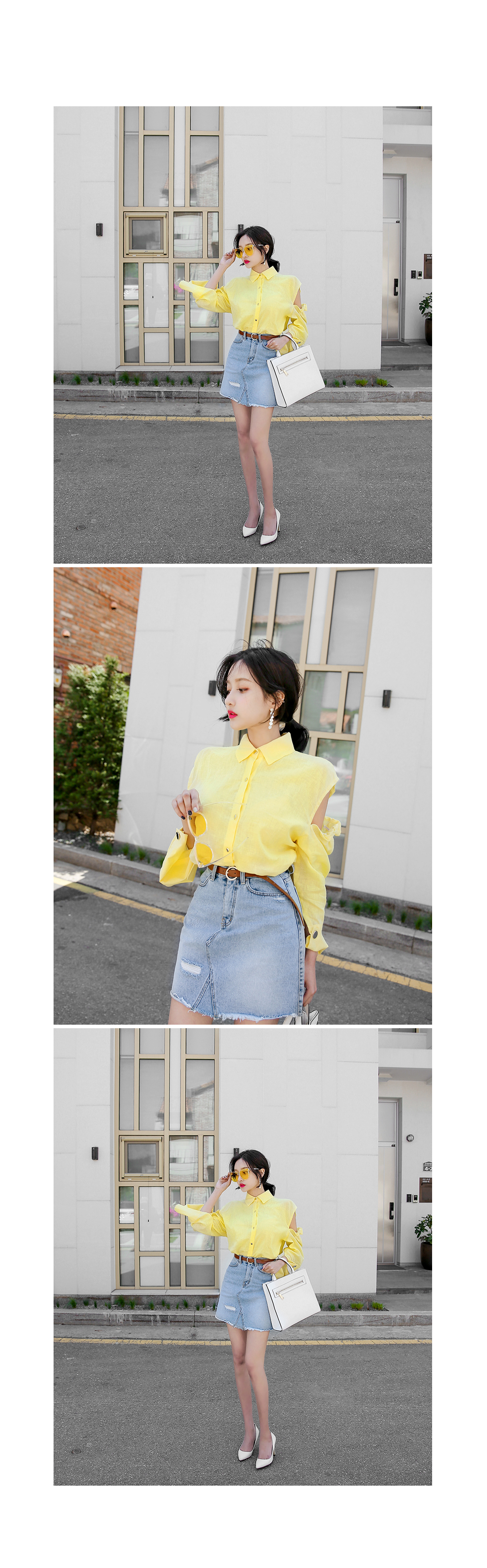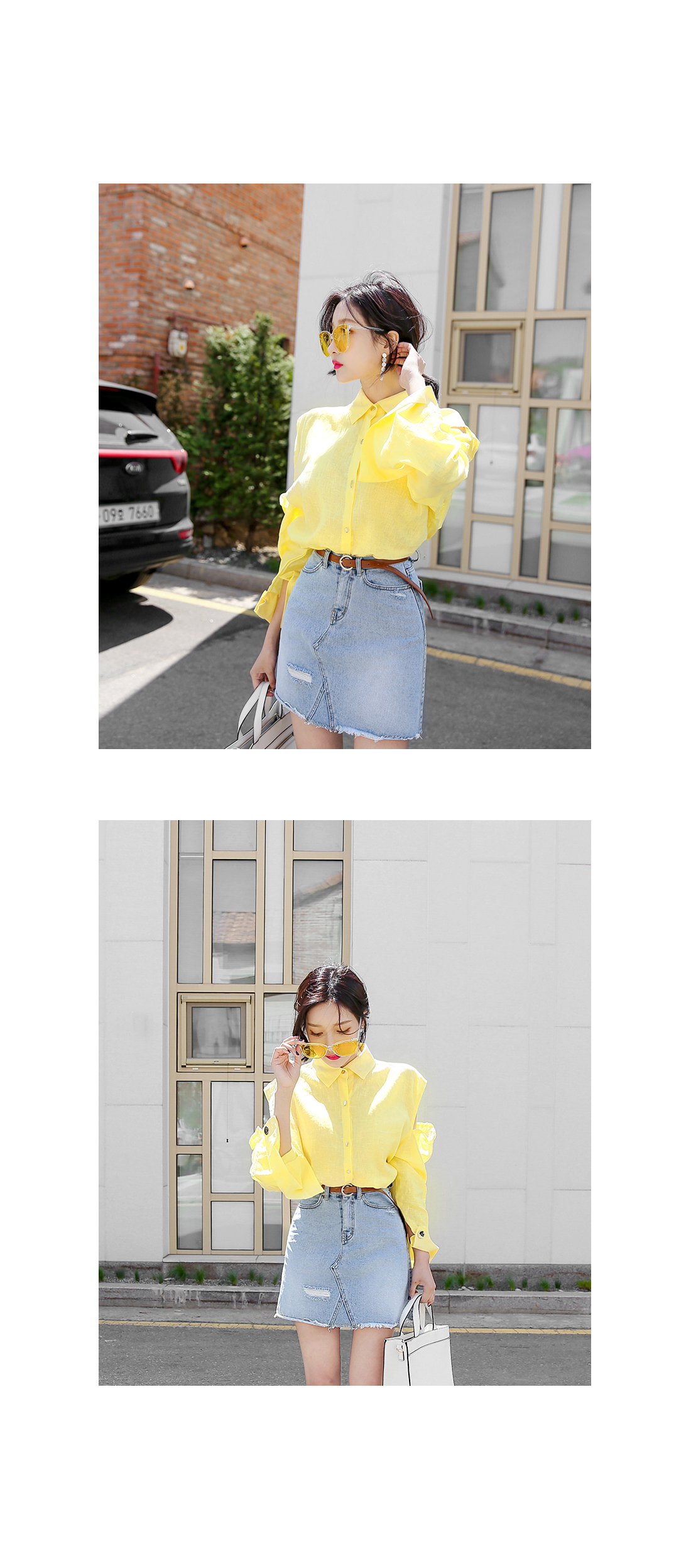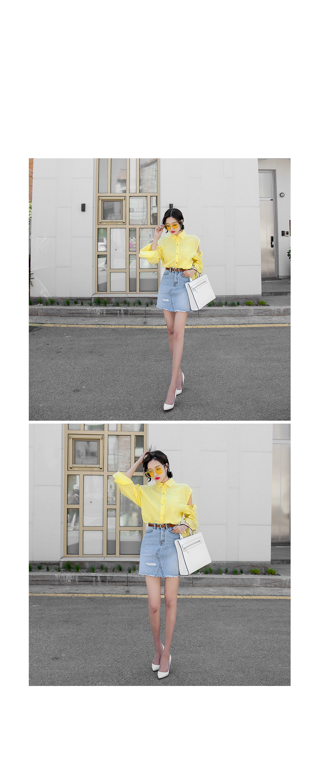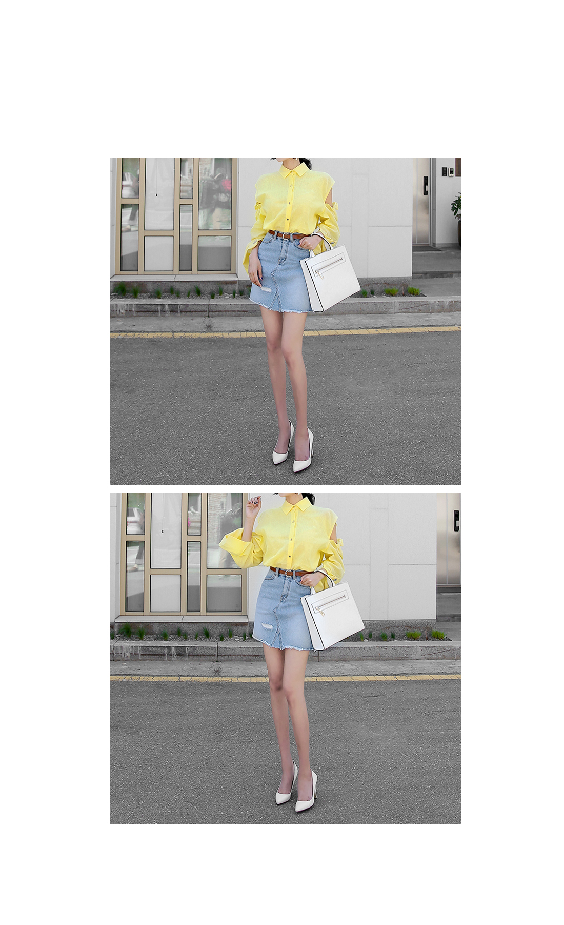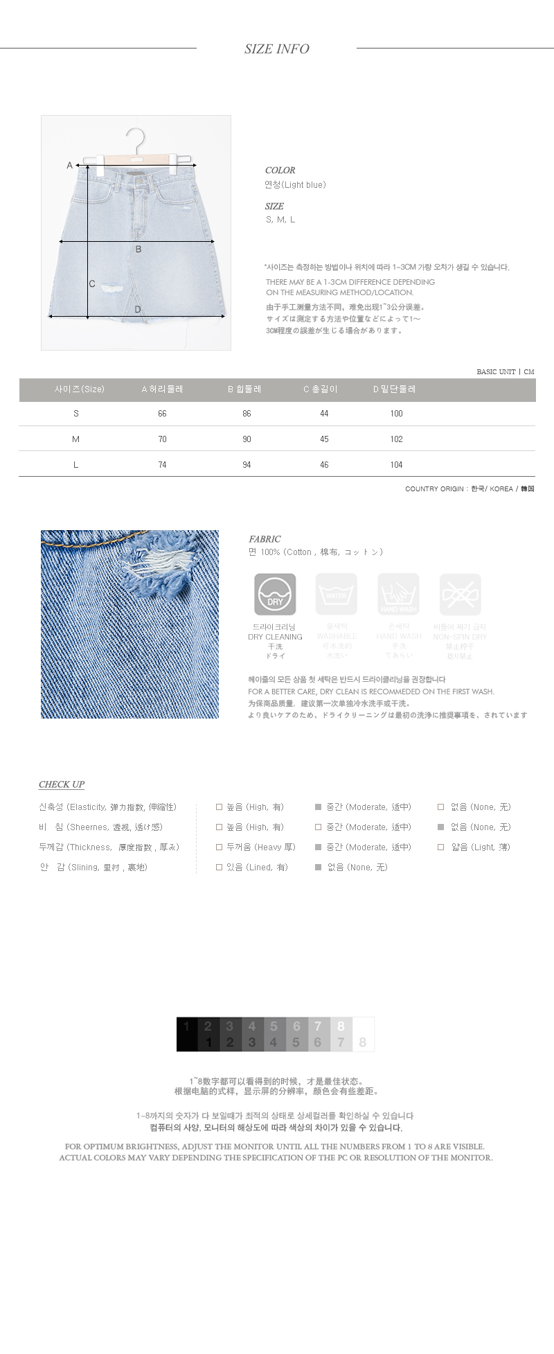 적당한 길이감과 은은한 워싱감이 가미된 데님 스커트 아이템을 소개해드릴께요~^^ 은은한 워싱감으로 화사한 컬러감의 티셔츠,셔츠 아이템들과 매치하기에 알맞은 데님 스커트 아이템이예요~ 적당한 두께감으로 계절에 구애없이 스타일링이 가능하여 활용도 높은 데님 스커트랍니다~ 밑단 컷팅과 헤짐 디테일이 가미되어 착용만해도 스타일리시한 분위기를 연출해드리는 스커트 아이템예요~