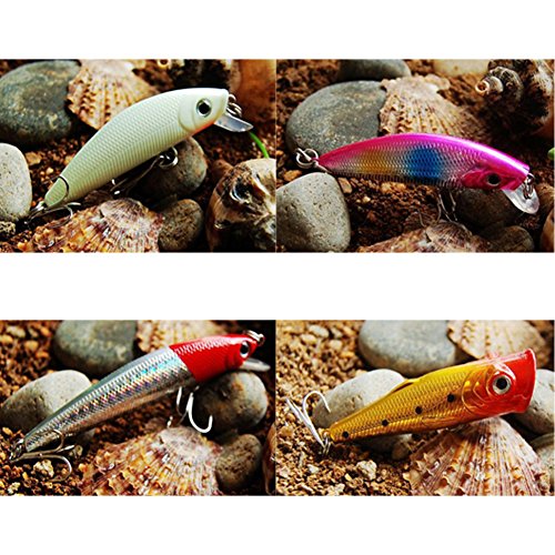 -. Feature : A huge impact on the way anglers target almost every kind of saltwater species / 2 MINNOW, 1 GLOW MINNOW, 1VIB, 1 POPPER / 5 PCS variety pack fishing lures with tackle box / Produces an aggressive, hard-cutting, darting action that drives every fish to strike / Each of these lures are unique, some dive deep, some shallow while others just thrash about on the surface