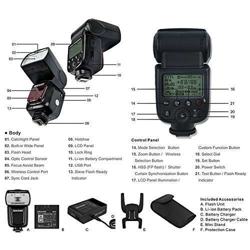 - Feature : Powerful Flash with High Guide No.58(ISO 100, 105mm). Flash Modes includes TTL, Master, Slave, Off, M, Multi, S1, S2. High-speed sync up to 1/8000th of a second. Support HHS, FEC,FEB, FV Lock, Front & Rear Curtain Sync, Modeling Flash, Control with Camera's Menu Screen, etc. / Professional Lithium battery ultra-high capacity batteries- 2000mAh each : Faster, Longer and More Portable. / The Trigger & Receiver set is a must-have accessory for TT860 lithium powered portable flash. It transforms the Flash into a Wireless Flash with Remote Power Control. / AC Charger: This charger offers rapid charging, easy and reliable. Smart LED charging status indicator displys how many juice the battery has. Short circuit protection. / Kit Includes: (2)Neewer TT860 E-TTL Flashs for Canon with Batteries and Chargers + (1)FT-16S 16 Channels Wireless Flash Trigger (Includes 1 x Transmitter and 2 x Receivers)