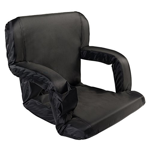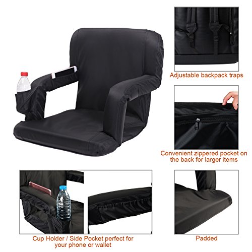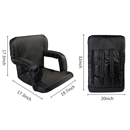AceLife Stadium Seat Portable Reclining Bleacher Chair with Cup Holder and Phone Pocket - Set of 2, Black Specifications: - Cover Material: 420 Polyester;bottom fabric:pvc leather - Steel tube: Dia0.75*0.04inch - Multiangle: 5 Position - Product Size(LxWxH): 32*20*2inch - Gross Weight: 15lb -Package: 2xFloor Armchair Description: This comfortable, portable padded seat is so versatile, Enjoy reclining at the beach, sitting at the park, sporting events, camping, bleachers and more ,It comes with 5 reclining positions, adjustable backpack style straps for easy carrying and padded armrests for extra comfort. It can be adjusted to completely flat so you can easily store it in your closet or just place it under your sofa when you don't use it.