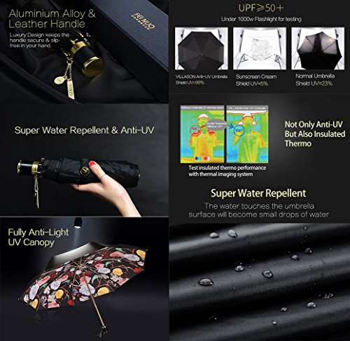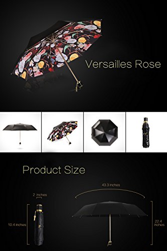 -. Binding : Misc. -. Brand : VILLASON -. Color : Versailles Rose -. EAN : 0709998941295 -. Feature : ★LUXURY DESIGN-Aluminum Alloy & Leather Handle; Gold Plated Luxury Top; Creative Polygon Shaft; Handcraft Sewing Canopy; 8 Sturdy Fiberglass Ribs / ★SUPERIOR UV PROTECTION-Top High-density 210T fabric canopy can shield UV as high as 99% with black coating nanotechnology. / ★MULTIFUCTIONAL UMBRELLA-Protect you from rain and sun. Double use high quality compact travel umbrella with features of UV protection, Waterproof and windproof features. / ★QUALITY MATERIALS-Umbrella canopy is made with 210T polyester and coated. Fortified frame is made with 8 durable fiberglass ribs. Aluminum Alloy & Leather Handle keeps the handle secure and slip-free in your hand. / ★COMPACT AND ULTRA LIGHT-Our umbrella is small enough to fit in your bag; it will also complement your style if hand-carried. At 10.4 inches in length and 0.8 pound in weight it is a lightweight accessory, whether in a bag or in your hand. -. IsAutographed : 0 -. IsMemorabilia : 0 -. Label : VILLASON -. Manufacturer : VILLASON -. ProductGroup : Sports -. ProductTypeName : SPORTING_GOODS -. Publisher : VILLASON -. Studio : VILLASON -. Title : VILLASON ® Versailles Rose UPF 50+Anti UV Windproof & Waterproof Compact Travel Umbrella✪Sturdy Canopy Construction 5 Layers Nano coating for UV Protection✪Luxury Design-Aluminum Alloy -. UPC : 709998941295