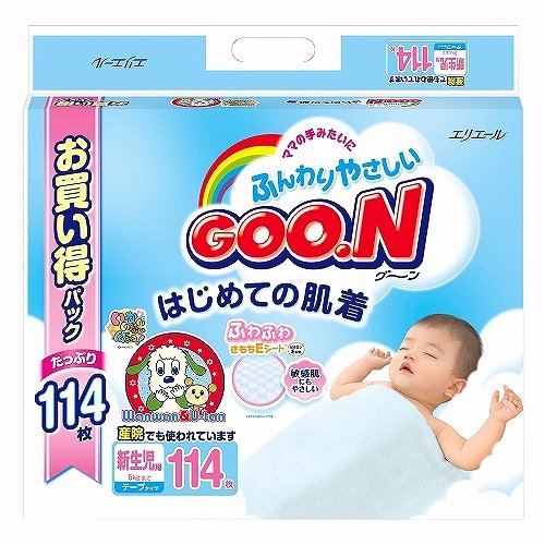 Unglaublich weiche und dünne Windeln, die Feuchtigkeit sofort aufnehmen und lange in sich behalten. Hypoallergen, rufen keine Hautreizungen hervor. Enthalten natürliches Vitamin E, das die Haut ernährt und ihre Abwehrkräfte stärkt. Hervorragend luftdurchlässig, vermeiden somit Hautirritationen. Der Feuchtigkeitsindikator wechselt die Farbe, wenn die Windeln nass werden. Weiche Bündchen an den Rändern sorgen für den zarten Halt an den Beinchen und am Rücken und schützen vor Auslaufen. Luftige und weiche Oberfläche innen Superweiche dünne Windeln berühren die Haut zart und sitzen wie gewöhnliche Unterwäsche. 3D-Relief vermindert die Fläche, die die Babyhaut berührt. Luftige Innenseite mit natürlichem Vitamin E bietet dem Baby zusätzlichen Schutz und Komfort.Atmungsaktive Außenschicht Mikroporen lassen die Luft zur Babyhaut durch und ermöglichen die Abgabe der Feuchtigkeit nach außen.Ohne Duftstoffe Alle Stoffe, die bei der Herstellung von GOO.N Windeln verwendet werden, sind hypoallergen und maximal natürlich. Die Windeln sind mit keinen Duftstoffen durchtränkt und geruchsneutral.Bildergeschichten Auf jeder Windel gibt es phantasievolle Bilder mit Tiergeschichten, wie aus einem Kinderbuch.Fixierendes Verschlussband ist mehrfach benutzbar Das Verschlussband kann mehrmals angebracht und abgelöst werden, während die Windelgröße an die Babyfigur angepasst wird.Geruchsneutralisierung Der Absorber zieht nicht nur die Feuchtigkeit sofort ein und behält sie sicher, sondern neutralisiert auch den Geruch.Füllungsindikator Werden die Linien des Indikators nass, wechselt die Farbe von Gelb auf Blau und benachrichtigt die Eltern, dass es Zeit ist die Windel zu wechseln. GOO.N ( Goon ) Premium qualität japanische Windeln New Born Gr. XS (bis 5 kg) 114 Stück // Японские подгузники GOO.N ( Goon ) New Born (bis 5 kg) 114 StückFeature