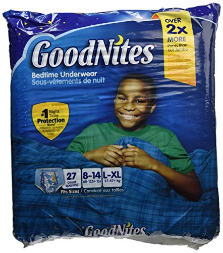 Goodnites Underwear for Boys GoodNites Underwear are the most absorbent pant for boys and girls ages 4 and up. Specially made to protect while lying down, they help keep pajamas and bedding dry all night long and feature plush comfort with a discreet design. GoodNites are 40% more absorbent than other solutions. They offer protection in any sleeping position and are designed for kids 4 and up, clothing sizes 4-14. The right protection is key to drier nights, so GoodNites Underwear come in a variety of sizes for growing kids ages 4 and up. Our small/medium size is similar to clothing sizes 4-8; large/extra-large is similar to 8-14. Features: Soft, quiet fabric Comfortable feel Cool graphics NOTE: Packaging may vary from image shown.Feature