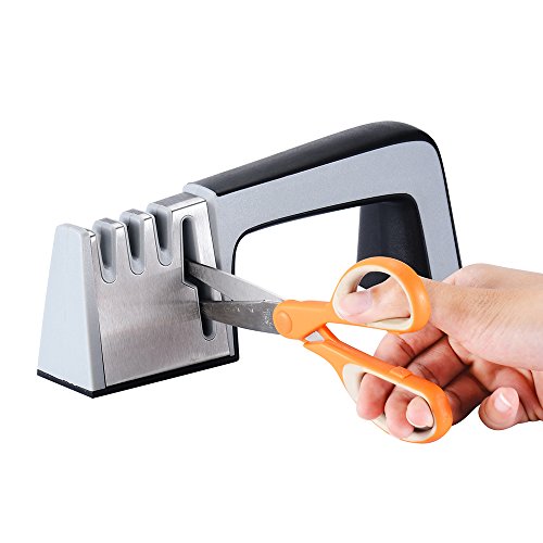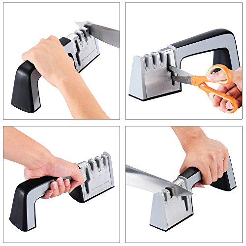 Multifunction: 4 in 1 professhional knife and scissors sharpener for kitchen. Slot 1 for Scissors Grinding, Slot 2 Coarse Grinding for dull metal knives, Slot 3 Medium Grinding for daily usage or ceramic knives, Slot 4 Fine Grinding for finishing and polishing edges.