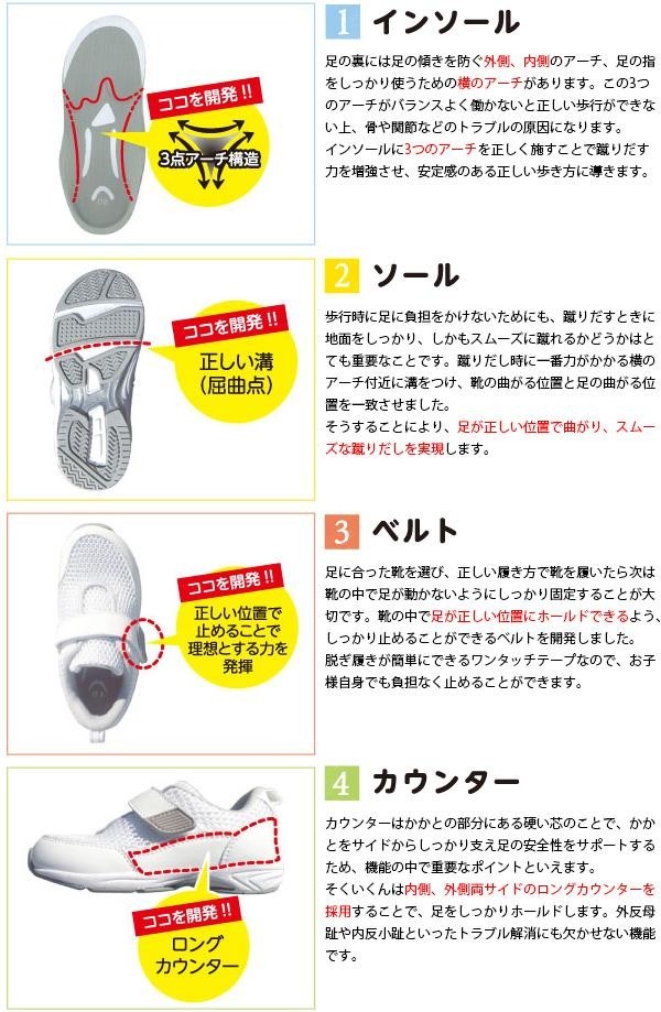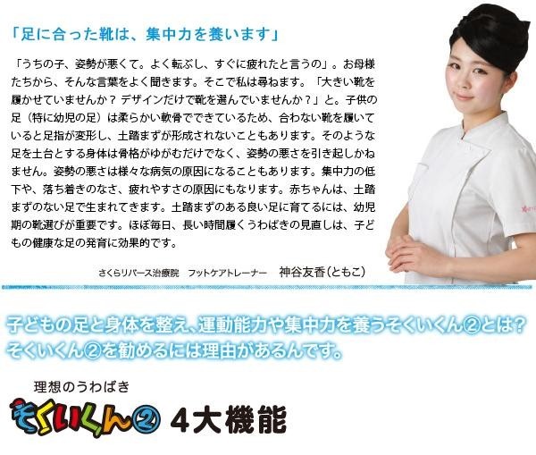 | 「理想のうわばき そくいくん2」は子育て中のママたちにご協力いただき、さくらリバース治療院監修の下、足の勉強会、試作体験会を経て作られました。足指でしっかり地面を掴めるインソールや横倒れ防止の長いカウンターで足を固定し、安定感抜群!!足運びをスムーズにするアウトソールを使用しているので歩きやすさも抜群です!! |