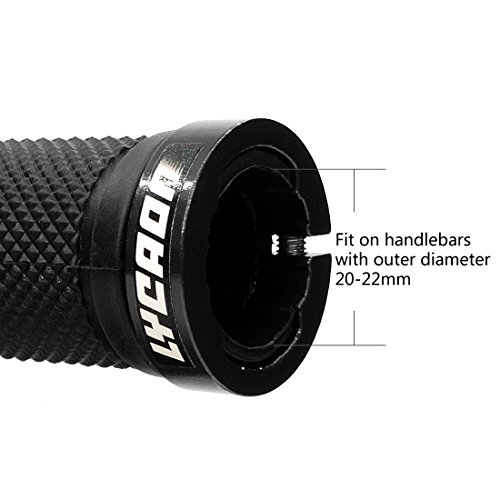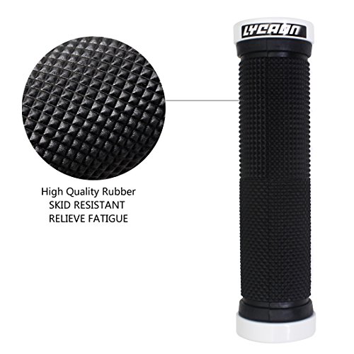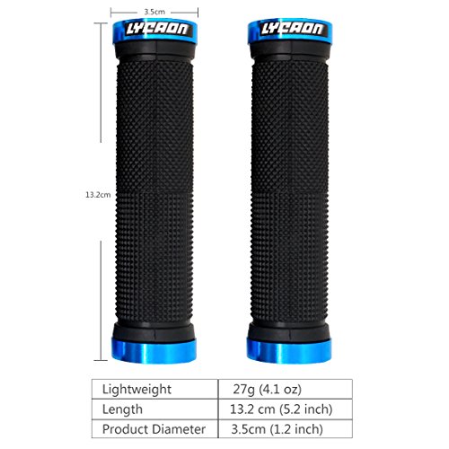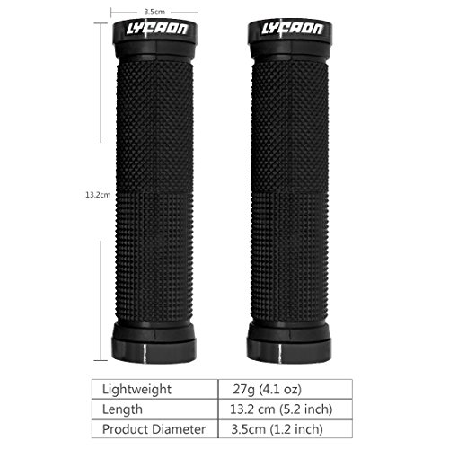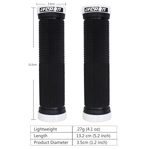 Studio : LYCAON Publisher : LYCAON Product Description LYCAON Wide Apply Handle Bar Grips Size: Length: 13.2 cm ( 5.2 inch ) Product Diameter: 3.5 cm ( 1.2 inch ) Weight: Weight (per pair): 27g ( 4.1 oz ) Suitable for: Bike handlebars with outer diameter 20-22mm 4 Colors Available: Black bike grips White bike grips Red bike grips Blue bike grips Package: Handle bar grips × 2 Handlebar caps × 2 Screwdriver × 1 Warranty: Worry Free Warranty at LYCAON: 15 MONTHS Warranty Guaranteed. Your feedback and review have been our biggest motivation. Please leave your feedback review so that we can create more practical products. 0