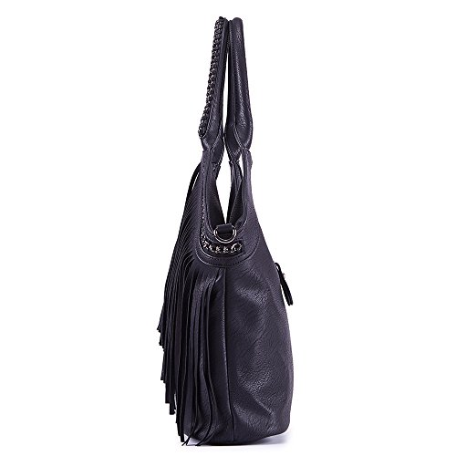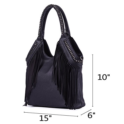 -. Brand : Celaine -. Department : womens -. Feature : Hand Manufactured Using Premium Faux Suede Leather Material / Beautiful Vintage Tassel Suede Leather Design Look / Zipper Closure with Lots of Room to Store Purse, Wallet, Makeup, Phone and other essentials / Outer and Inner Zipper Compartment. Includes Hand and Shoulder Straps. / Dimensions: 15 x 10 x 6 Inch -. ProductGroup : Shoes -. ProductTypeName : HANDBAG -. Title : Celaine Womens Handbags Tassel Cross Body Shoulder Bag Hobo Satchel - Large Storage - PU Suede Leather, Black