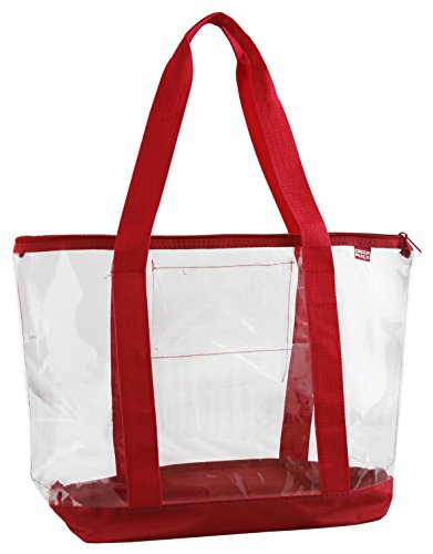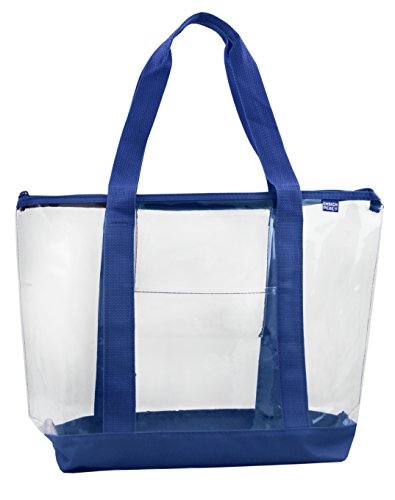 Clear zipper tote with color trim and bottom. Features a full length zipper top, shoulder length handles. 19 inches wide x 14 inches high x 6 inch gusset. Materials: .3mm clear PVC with 600D Poly bottom.