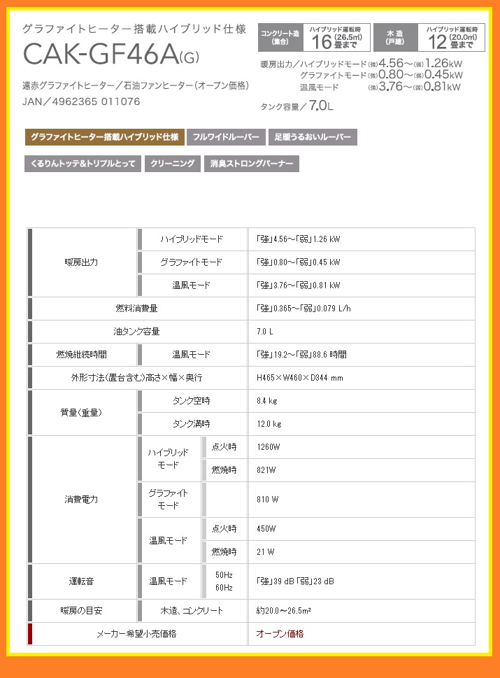 ●暖房効果の高い石油ファンヒーターに速暖のグラファイトヒーターを搭載したハイブリッド仕様の石油ファンヒーター
