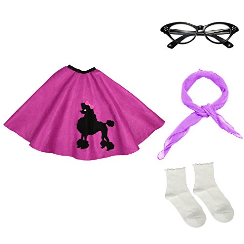 Package include: 1 x Poodle Skirt; 1 x 50's Chiffon Scarf; 1 x Cat Eye Glasses; 1 x Bobby Socks Great for school plays, sock hops, Halloween, 50's Party, and more