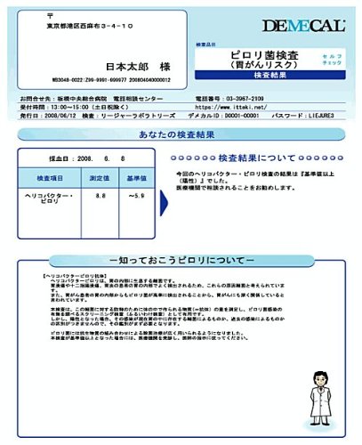 -. Binding : Health and Beauty -. EAN : 4560154850488 -. Feature : In H. pylori test kit, we measured the amount of antibody made by the body against H. -. IsAdultProduct : 0 -. Label : DEMECAL -. Manufacturer : DEMECAL -. ProductGroup : Health and Beauty -. ProductTypeName : HEALTH_PERSONAL_CARE -. Publisher : DEMECAL -. Studio : DEMECAL -. Title : Demekaru Pylori Bacteria Test Kit