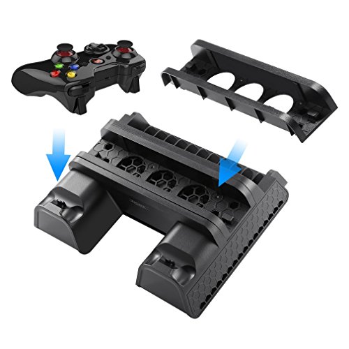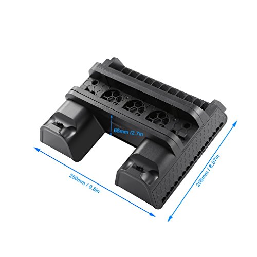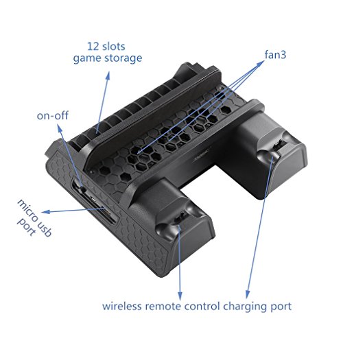 Perfect Design:There is anti-slip EVA on its two sides to avoid scratching and slipping of the PS4, PS4 Slim or PS4 Pro console.And the ps4 stand with cooling fan has all-in-one design of space saving vertical stand with high speed fans,game disc storage and portable charging station.