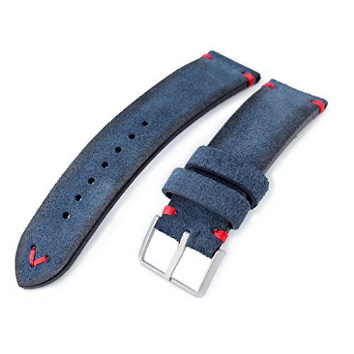 -. Title : 21mm MiLTAT Navy Blue Genuine Nubuck Leather Watch Strap, Red Stitching, Sandblasted Buckle
