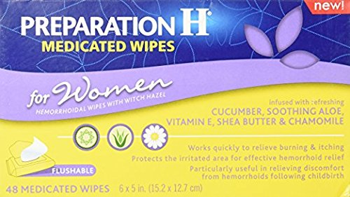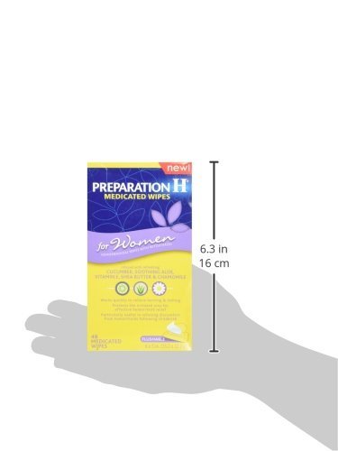 Studio : Preparation H Publisher : Preparation H Binding : Health and Beauty Product Description Preparation H Medicated Wipes for Women are the first and only women's hemorrhoid wipes infused with chamomile, aloe and refreshing cucumber, plus a soothing medication that cools on contact. They protect the irritated area for effective hemorrhoid relief. Preparation H Medicated Wipes for Women can be used for gentle, everyday cleansing to cool and soothe. Use before Preparation H Gel, Ointment, Cream or Suppositories for better relief. 0