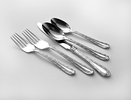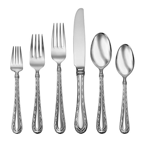 Studio : Oneida Publisher : Oneida Product Description 114-piece flatware set with service for 12. Set includes 12 each: Dinner knife, Steak knife, Dinner Fork, Salad/Dessert Fork, Soup/Cereal Spoon, Teaspoon, Round Bowl, Tall Drink and Dessert Fork. plus 2 Serving Spoons, 2 Serving Fork, Pierced Spoon, 1 Gravy Ladle. Made from durable and stylish 18/10 stainless steel.This classically inspired silverware soothes the senses and the soul. Merlot's detailed architectural border brings symmetry, grace, and balance to its tapered, teardrop-shaped handle. The set is dishwasher safe and never needs polishing. Each piece of fine quality Oneida stainless is warranted against defects in workmanship and materials for the lifetime of the original owner 0