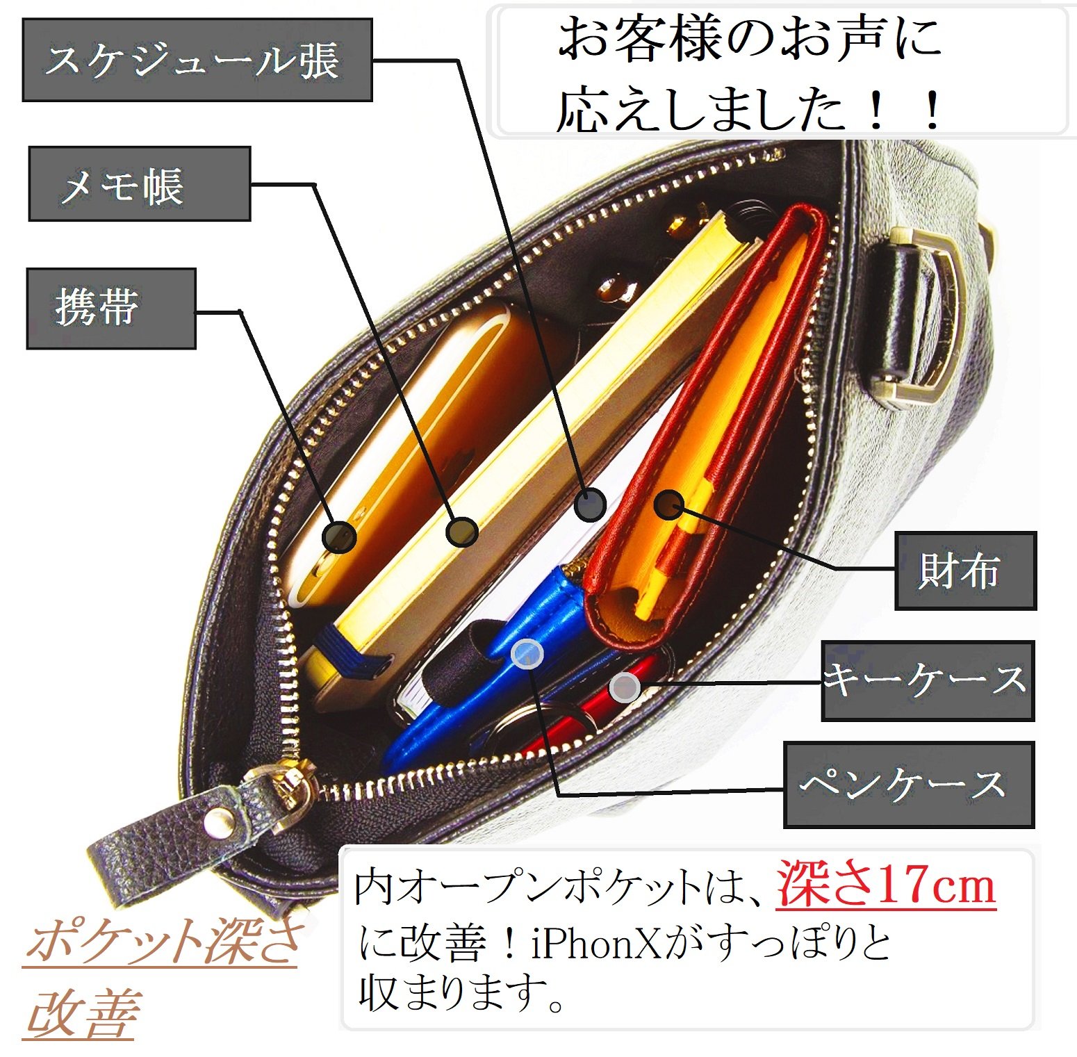 The inner pocket has been improved to fit iPhonX completely.