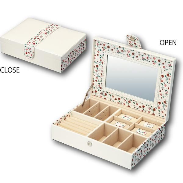 | 内側やネックレスホルダーにもフラワープリントのフェイクレザーを使った、こだわり仕様のジュエリーボックスです。本体は触れる度に高級感を感じることができます。ミラーが付いた豪華仕様。可愛い見た目に反して、収納力バツグン! |