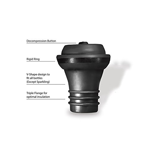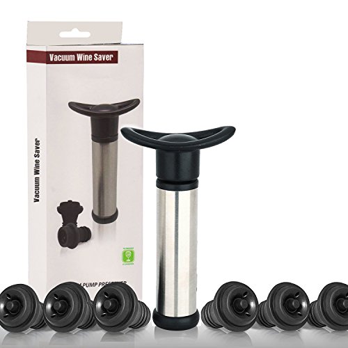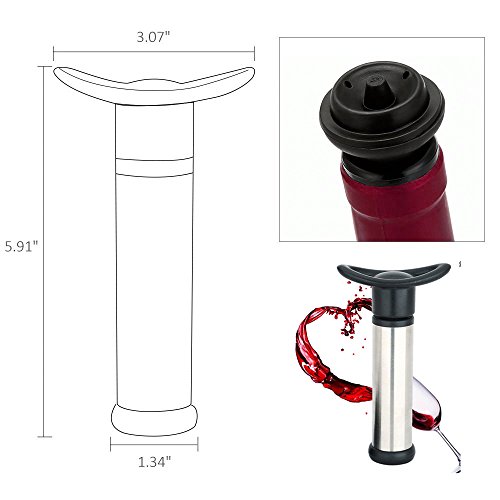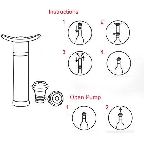 Product Description This easy-to-use Wine Saver pump set removes excess air from open bottles for a virtually airtight seal. The vacuum action helps preserve the subtleties and flavor characteristics of the wine as it sits. Simply press one of the included rubber caps onto an open bottle, press the pump opening over the cap head, and then draw out the pump plunger. * Avoid tossing perfectly good wine * Set of 7 includes: 1 Vacuum Pump 6 Stopper Caps * Time efficient, money saver: no more wasting pricey drink or tossing away * Silver color pump sleeve, black stoppers: elegant design vs. rugged engineering * Does Not suit for sparkling wine type bottles such as Champagne, Prosecco or Cava * Stoppers Material: Food-Grade silicone 100% Satisfaction Guarantee - If it doesn't live up to your high standards then we will refund your money back no questions asked! Note: Do not rinse the cap with hot water to prevent distortion. 0