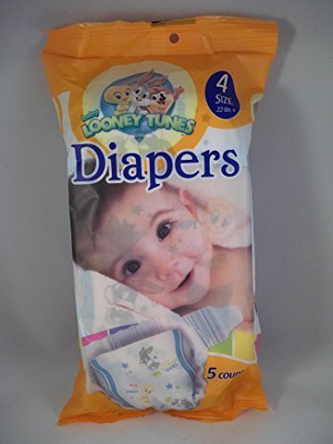 5 Count Package of Size 4 ( 22 lbs. + ) Diapers With Looney Tunes Theme. Features include: Absorption Layer Stretchable Tabs Elastic Leg Bands Leak Prevention Cuffs Clothlike & Breathable & Wetness Indicator