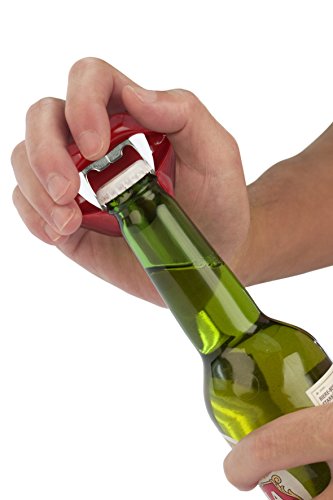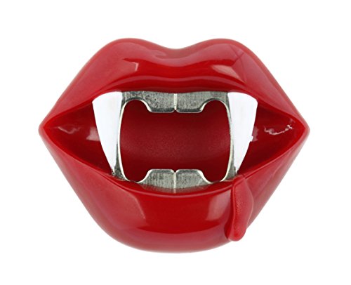 - Handheld bottle cap popper features ruby red mouth with Dracula fangs and teeth as opener