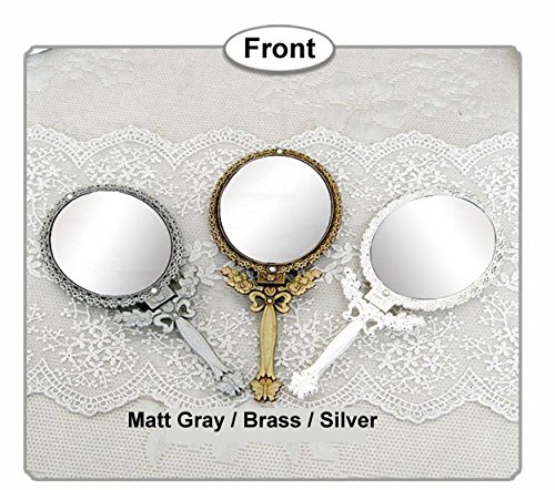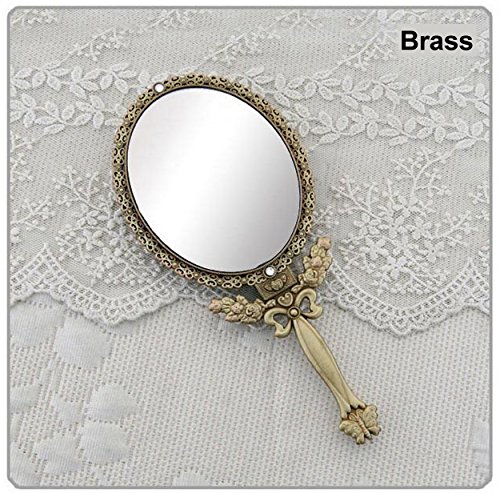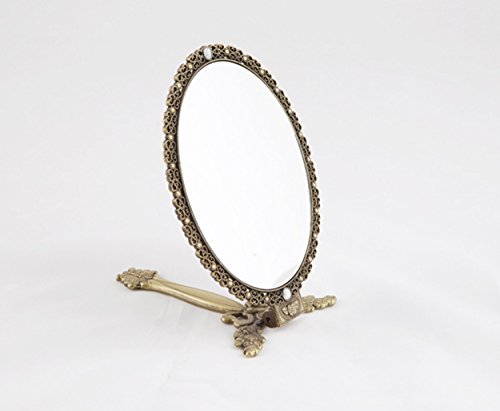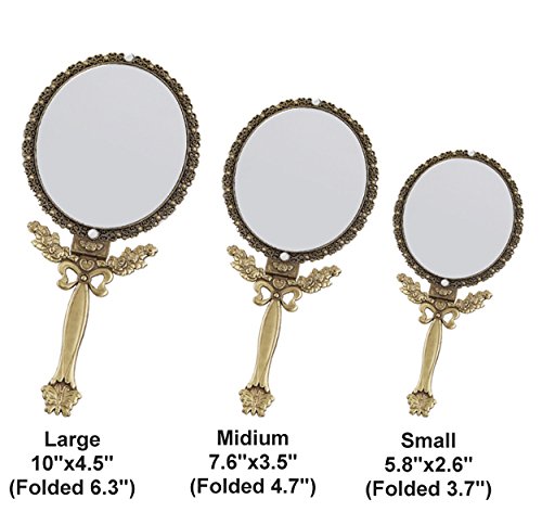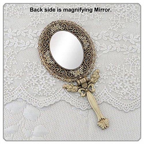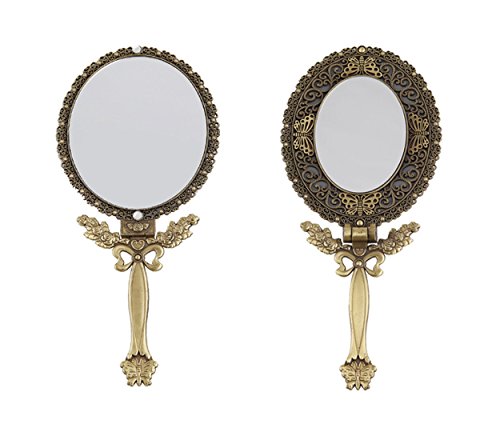 Butterfly Designed Double Sided Magnification Hand Held Makeup Metal Mirror Folding Handle Stand Travel Mirror (Large, Brass)