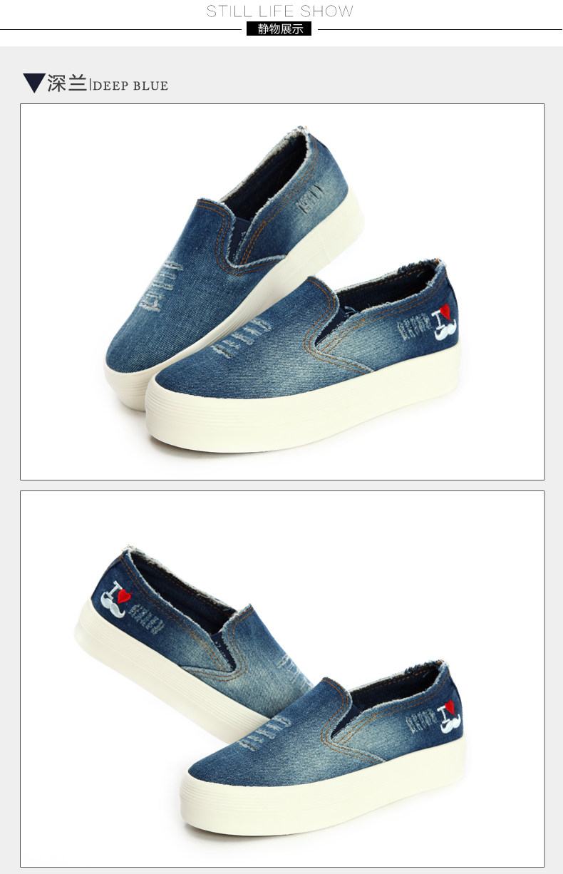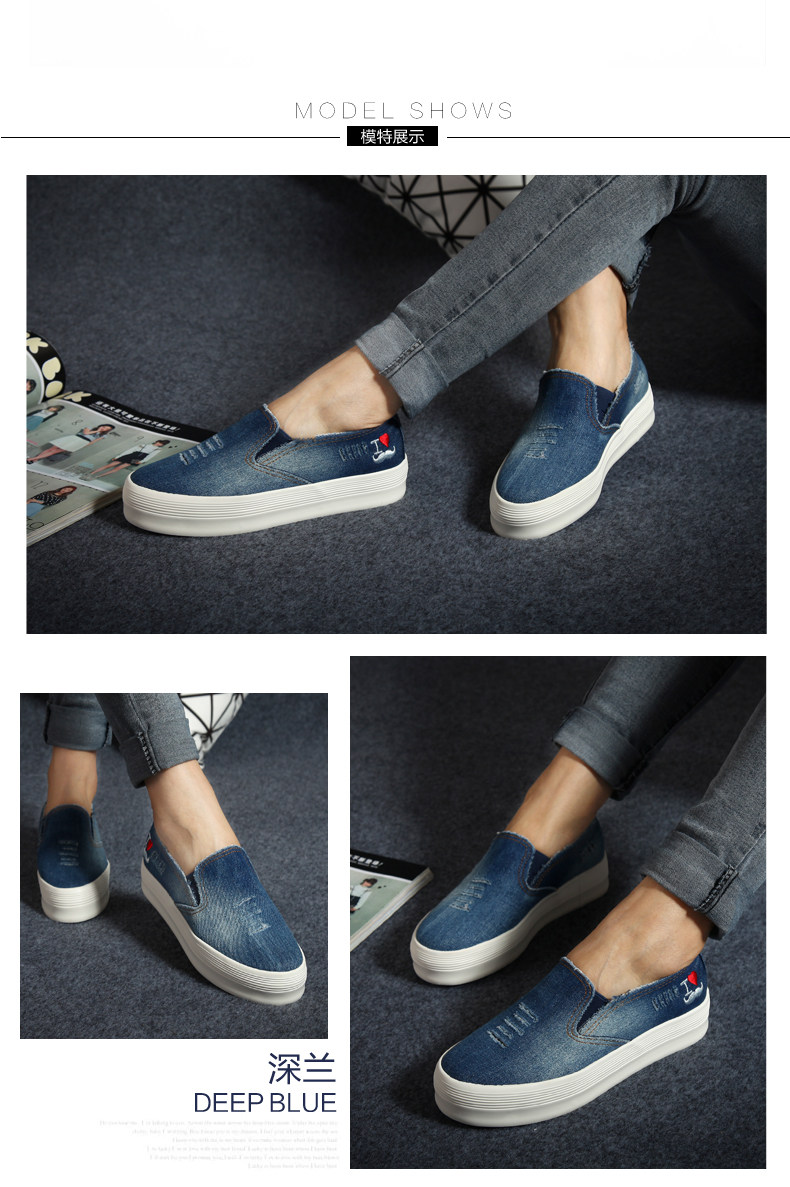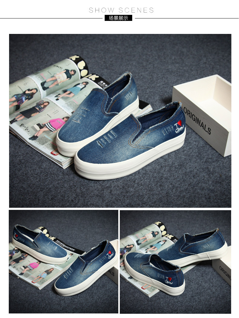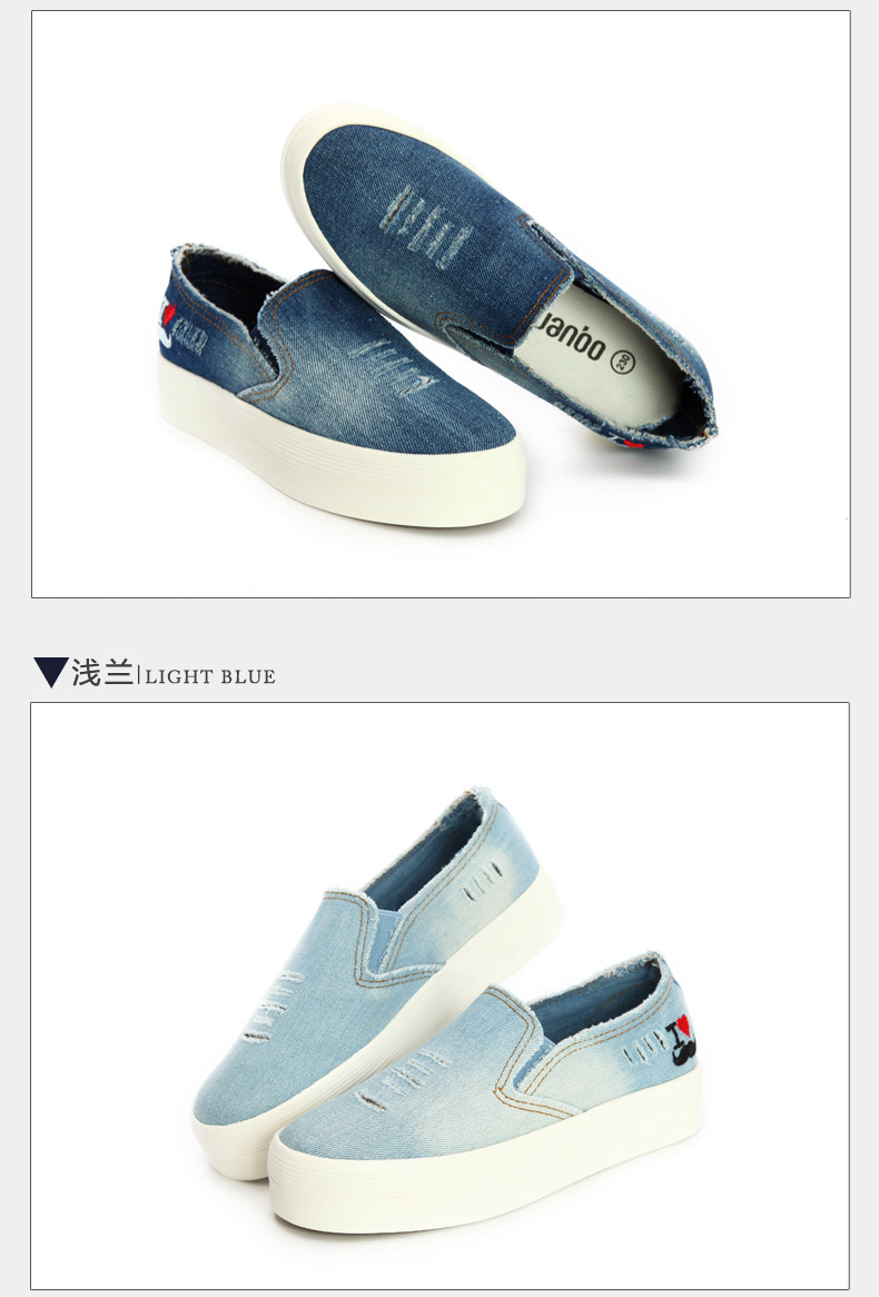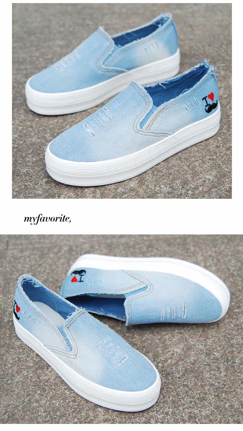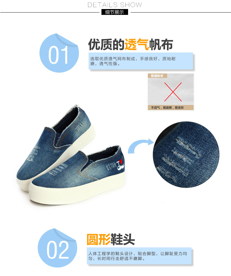 一脚蹬厚底帆布鞋女 牛仔布破洞透气乐福鞋 韩版学生休闲套脚板鞋