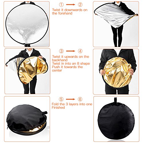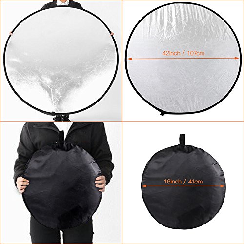 SAMTIAN 5 in 1 multi photo reflector kit disc 43" / 110CM is specially for professionals or amateurs. It is a must for studio or outdoor photography. Specifications Shape: Round Size open: 43 inches (110cm) Size collapsed: 15 inches(35 cm) round Fits any standard reflector holder. It comes with silver, gold, black, white and translucent. Those are the most popular reflector in photograph. Silver - for contrast and increase highlights, Gold - achieve warm glowing skin tones,Black - block out unwanted light, White - produce neutral color temperature, Translucent - for softer look without shadow Durable and flexible steel spring frame insures easy spreading and closing. Package includes 1x Reflector 1x Portable carrying bag 0