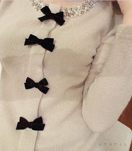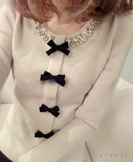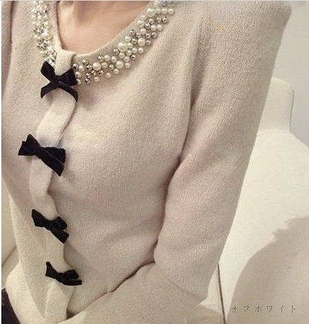 <<スーパーSUMMER SALE>>★キラキラパールビジュー付きトップス★ネック部分についたパールビジューと中央のリボンがアクセントで可愛い一枚です♪▼サイズ▼着丈:約59cm/肩幅:約37cm/袖丈:約57cm/袖口まわり:約20cmバスト:約86~98cm/裾幅:約90cm▼素材▼伸縮性あり/透け感多少あり/アクリル100%<お取り扱いの注意>水濡れや強い摩擦により移染する恐れがありますので、洗濯は他の物と分けて洗ってください。タンブラー乾燥は避けてください。※注意事項※商品画像はできる限り実物の色に近づけておりますが、モニター・パソコン等の画像解像度により実際の商品と多少色味が異なる場合がございます。色味が異なるなどのクレームはお受けできませんのでご了承ください。海外・機械による生産のため、生地の継ぎ目に若干のズレや多少のほつれによる、形やサイズに多少の誤差が生じる場合がございます。また、混紡繊維によって生地の織りの他繊維が混紡している場合がこざいますが品質上の問題はございません。予めご了承くださいますようお願いいたします。