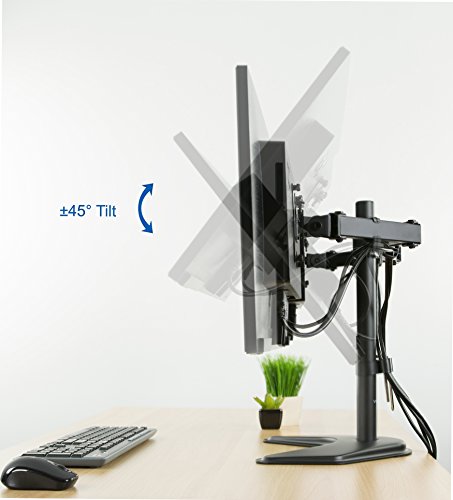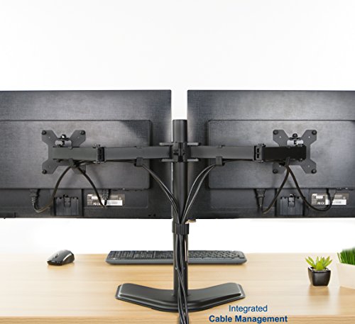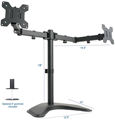 New dual monitor free-stand standing (model STANDV002F) made of high grade steel and aluminum from vivo. Fits most LCD monitors 13" to 27" and supports up to 22 lbs per monitor. Every joint is able to be tightened, so you can adjust exactly how fluid/stationary you want everything to be. Special features include the ability for each individual vesa plate to be adjusted up and down by .5" so your monitors will be perfectly aligned (see pictures and video for more information). We also made mounting your monitors easy with detachable vesa plates that screw into your monitor and then slide back onto the frame of the stand. An optional bolt through grommet clamp is included with this stand. This has standard vesa 75x75mm and 100x100mm mounting holes. Mount uses vesa 75 x75 and 100 x 100 mounting holes. Features: 1) Tilt: 15 degree. 2) Swivel: 360 degree. 3) Rotate: 360 degree . 4) Height adjustable. 5) Integrated cable management system . 6) Monitor can be installed either in portrait or landscape shape. 7) Fully adjustable arms. Key measurements: from the desk to the top of the center post is 18". The distance between the square brackets that the LCDs mount to is 24" when full extended, and that is center to center. Base of the stand measures a 12.5" x 10" area.Feature