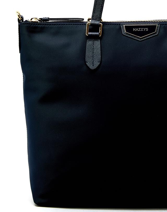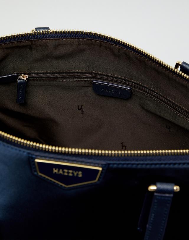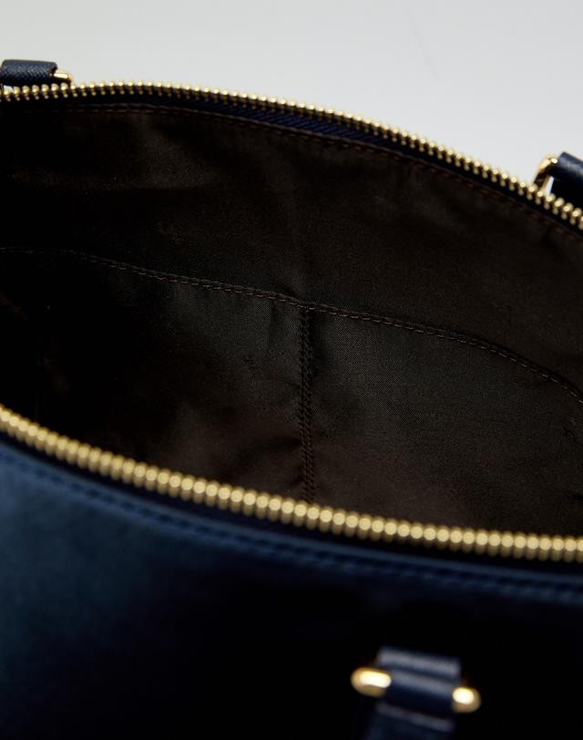 가죽을 배색하고 상단에 오각형의 로고 장식을 매치하여 포인트를 준 숄더백입니다.