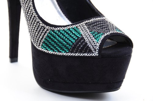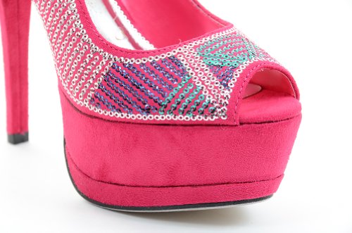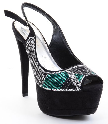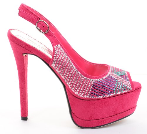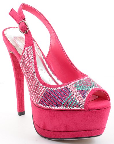 Product DescriptionShine bright tonight in this stunning round toe platform. Featuring sequin upper, classic peep-toe, adjustable slingback strap, tribute platforms, covered heels and finished with a slightly padded insole. Fourever Funky0