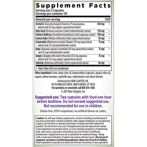 -. Feature : Sleep Support: Traditional natural sleep aid herbs can safely and gently support deep, restful sleep* / Herbal Anti-Inflammatory: Soothing sleep supplement delivers herbs for healthy inflammation response to promote a restful night* / Expertly formulated with potent, whole-food Valerian Root, Lemon Balm, Holy Basil & Turmeric / No Black Pepper Needed: Unlike supplements formulated with isolated curcumin, New Chapter uses pure WHOLE Turmeric with 100s of compounds, including Curcumin and Turmerones for optimal absorption / No Sugar (as found in melatonin gummies & other sleep gummies), Non-GMO Project Verified, Gluten Free, 100% Vegetarian, No Synthetic Fillers, Made in the USA, No Artificial Flavors or Colors, FDA & GMP compliant, 3rd-party tested