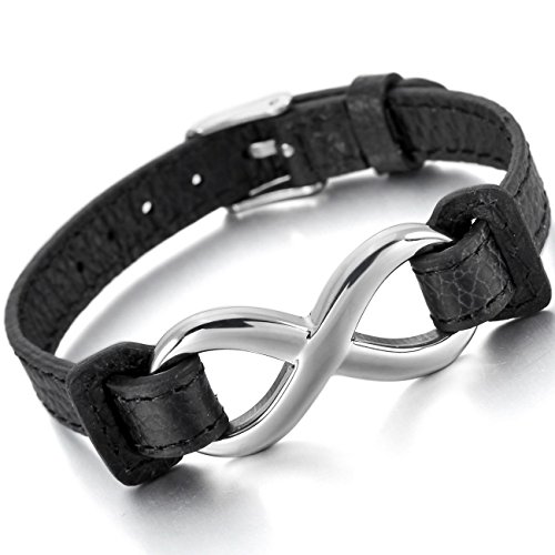 -. Title : MOWOM ブラック シルバー ステンレス 本革 ブレスレット バングル インフィニティ 無限大 シンボル 記号 愛 アジャスタブル 長さは調節可