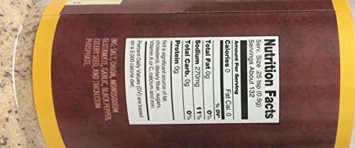 -. Feature : Product of USA. Pack of 3. / Kosher for Passover. / Fish Spice. / Serving Size 25 TSP (0.9g), Servings About 132. / Ingredients: Salt, Onion, Monosodium Glutamate, Garlic, Blackpepper, Celery Seed, And Tricalcium Phosphate.