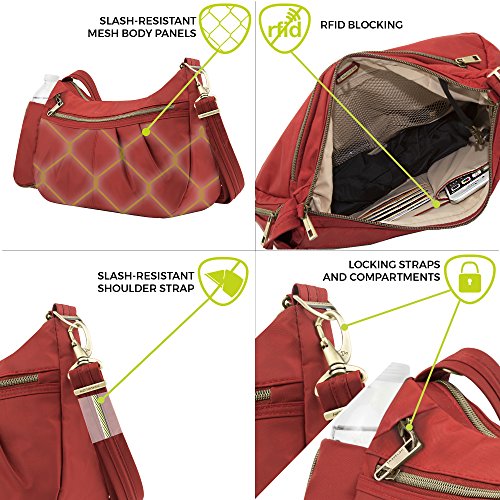This new bag has all the proctection you need along with cute ruching detail for a nice style flare. Comes with a locking main compartment with RFID blocking card and passport slots. Also, has slash-proof construction with an adjustable, cut proof strap which attached to a post or chair. It comes with a locking front zip pocket, rear zip pocket and a mesh expansion pocket that is prefect for a water bottle , includes a tethered key clip.Feature