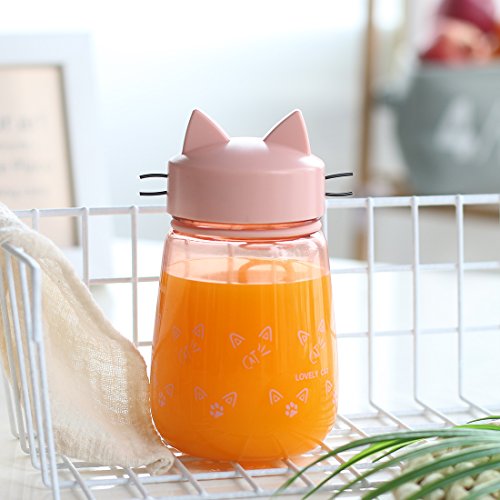 ONEISALL GYBL621 Cute Cat Mug with Lid and Portable Handle, Plastic Cat Water Bottle for Kids, 11.8oz (Pink)