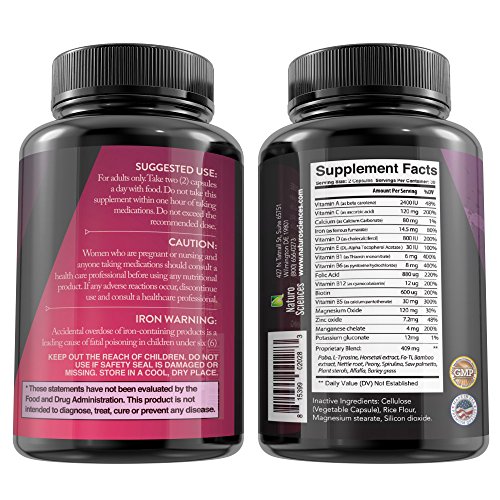 -. Feature : DISCOVER THE PERFECT WAY TO ENCOURAGE YOUR BODY'S HEALTH! - Our unique multivitamin formula is going to safely promote hair growth, gorgeous and healthy skin and strong nails! Your body deserves top priority treatment and we confidently provide it! / REGAIN YOUR CONFIDENCE TODAY! - This enhanced blend of natural and organic ingredients by Naturo Sciences, is the ideal way to encourage a healthy solution for your problems! You will feel strong and your confidence will be boosted! / UNIQUE NATURAL INGREDIENTS! - Our elite hair, skin and nails formula contains a unique blend of healthy and natural ingredients, such as spirulina, bamboo extract, biotin, L-tyrosine, vitamins A, C, D, E, calcium, iron and many more! / YOU DESERVE TOP PRIORITY TREATMENT! - This advanced hair, skin and nails treatment by Naturo Sciences is the best way to support your body in a natural and healthy way! It will help you look glowing, rejuvenated and strong! / 100% RISK-FREE SOLUTION! - We, at Naturo Sciences, believe that you deserve the best organic and multipurpose body treatment available! However, if you are not 100% satisfied with our advanced formula's results, we confidently offer a 60-day, no-hassle, money back guarantee!