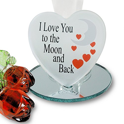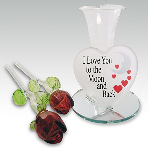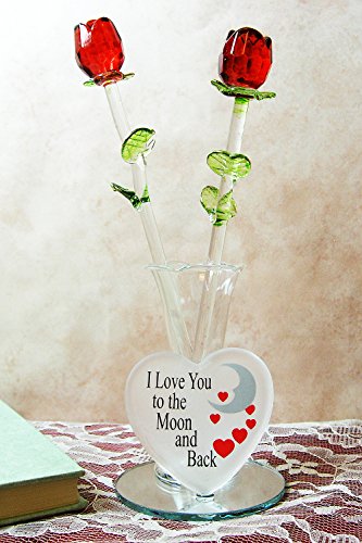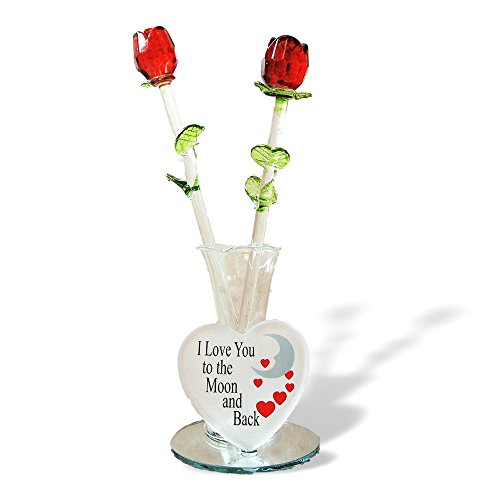 Forever Roses - Set of 2 Red Glass Roses in a Heart Shaped Vase - I Love You to the Moon and Back - Valentine's Day Gifts