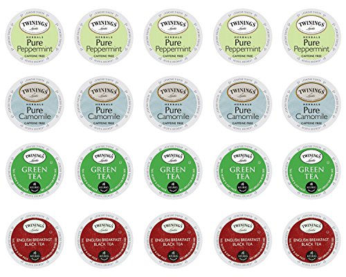 -. Binding : Misc. -. Brand : Twinings -. EAN : 0024606953416 -. Feature : Twinings - English Breakfast, Green Tea, Pure Camomile & Pure Peppermint K-cup Tea Sampler. / Sample a selection of Twinings tea without having to buy a full box of each. / 20 K-cups with 4 different varieties - 5 of each. / All K-cups are Keurig 2.0 compatible. / K-cups are repackaged into a similar box as the one shown in the above photo. -. ProductGroup : Grocery -. ProductTypeName : GROCERY -. Title : Twinings - English Breakfast, Green Tea, Pure Camomile & Pure Peppermint K-cup Tea Sampler for Keurig 2.0 - 20 Count/4 Varieties -. UPC : 024606953416