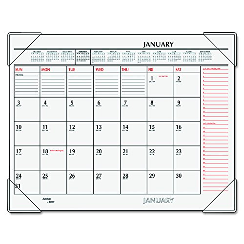 -. Feature : Keep your calendar where you need it - right in front of you, on your desk. 12 month desk pad follows the calendar year January - December. Julian dates. / One month per page format allows clear date reference. Large, unruled daily blocks provide plenty of space for notes. Each block is 2.37 in. x 2.62 in. / Note space is included each month and a Look Ahead column provides even more additional notes space for each day of the next month. Full year, 12 month calendar reference included along the top of each page and federal holidays are highlighted in red. / Durable backboard provides sturdy writing surface on your desktop and four black poly corners ensures pages stay flat / Desk pad is P.R.Inted with black and red ink on white heavyweight paper that contains 30% post-consumer weight. Page size: 22 in. x 17 in. Overall size: 21.75 in. x 17.12 in. x .06 in.