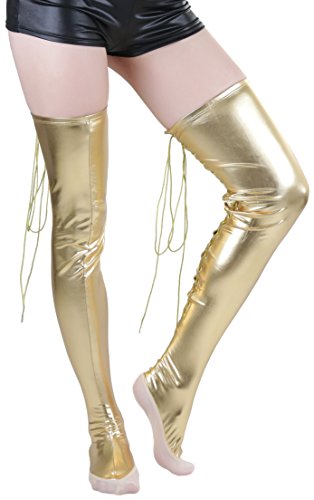 -. Binding : Apparel -. Brand : ToBeInStyle -. Department : womens -. Feature : Colors: BLACK, GOLD, SILVER / Recommended Care Instructions: Hand Wash. Line Dry. Do Not Bleach. Do Not Tumble Dry. Do Not Dry Clean. / One Size Fits Most / Pull-On Closure / Materials: 100% NYLON -. ProductGroup : Apparel -. ProductTypeName : SOCKSHOSIERY -. Title : ToBeInStyle Women's Lace Up Wet Look Thigh Hi