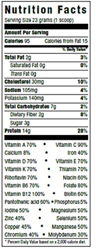 -. Feature : Chocolate Delight Protein provides protein, fiber, vitamins and minerals / Great Taste - 95 Calories & 14 grams of Protein per Scoop.