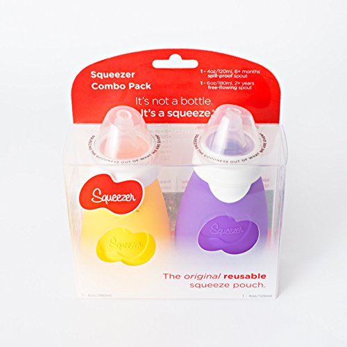 Studio : The Original Squeeze Company Publisher : The Original Squeeze Company Binding : Baby Product Product Description COMBO The best of both worlds - The spill-proof Squeezer and the free-flowing Squeezer with Eeeze! While the spill-proof spout is perfect for the youngest eaters and mess-free snacking on-the-go, the free-flowing spout is suitable for growing children who have graduated from spill-proof valves. Package Quantity: 2 Includes: Squeeze Pouch Features: No Spill Design, Reusable Capacity (volume): 10.000 Safety and Security Features: Phthalate-free, PVC-free, BPA-free Care and Cleaning: Dishwasher friendly top rack only Manufacturer's Suggested Age: 6 Months and Up Material: Silicone, Copolyester, Thermoplastic Elastomers Dimensions: 7.000 H x 2.000 W x 6.000 L Weight: 6.300 Assembly Details: no assembly required 0