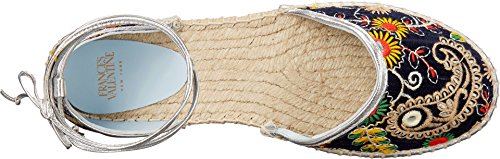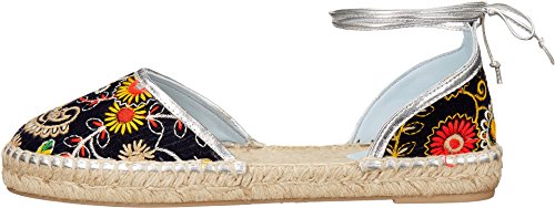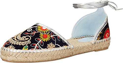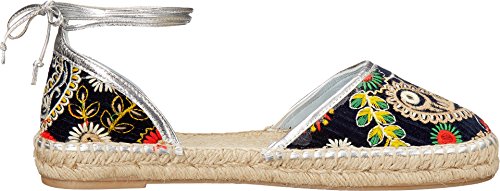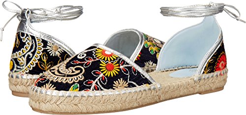 Product DescriptionColorful embroidery and mirrored accents lend a bohemian feel to these Frances Valentine espadrilles. Slim, metallic ties wrap the ankle. Braided jute footbed and platform. Rubber sole.0